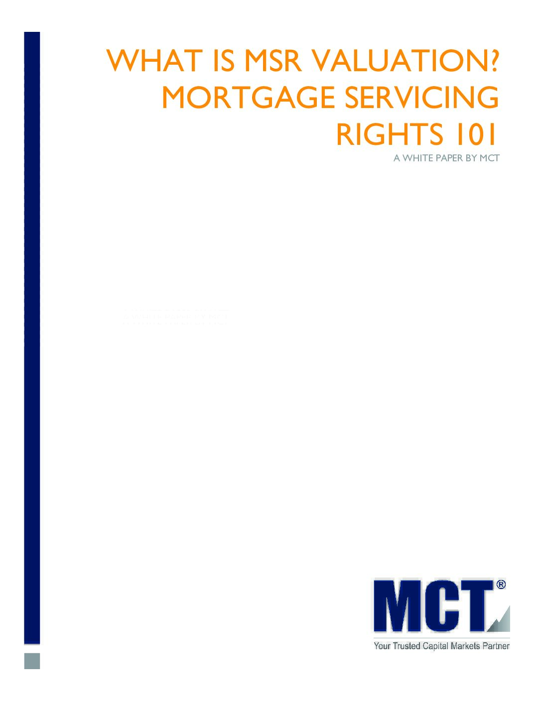 MCT also provides TMC members with special offerings related to MSR services, including valuation reports that make it easy to monitor your MSR asset and provide insights that inform strategies to effectively manage your portfolio.