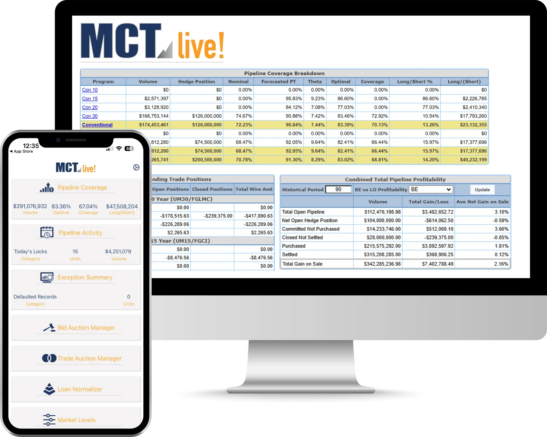 MCT provides offerings to help mortgage lenders manage loan pipeline risk, conduct electronic TBA trading, and optimize profit with our comprehensive loan trading platform, MCTlive!